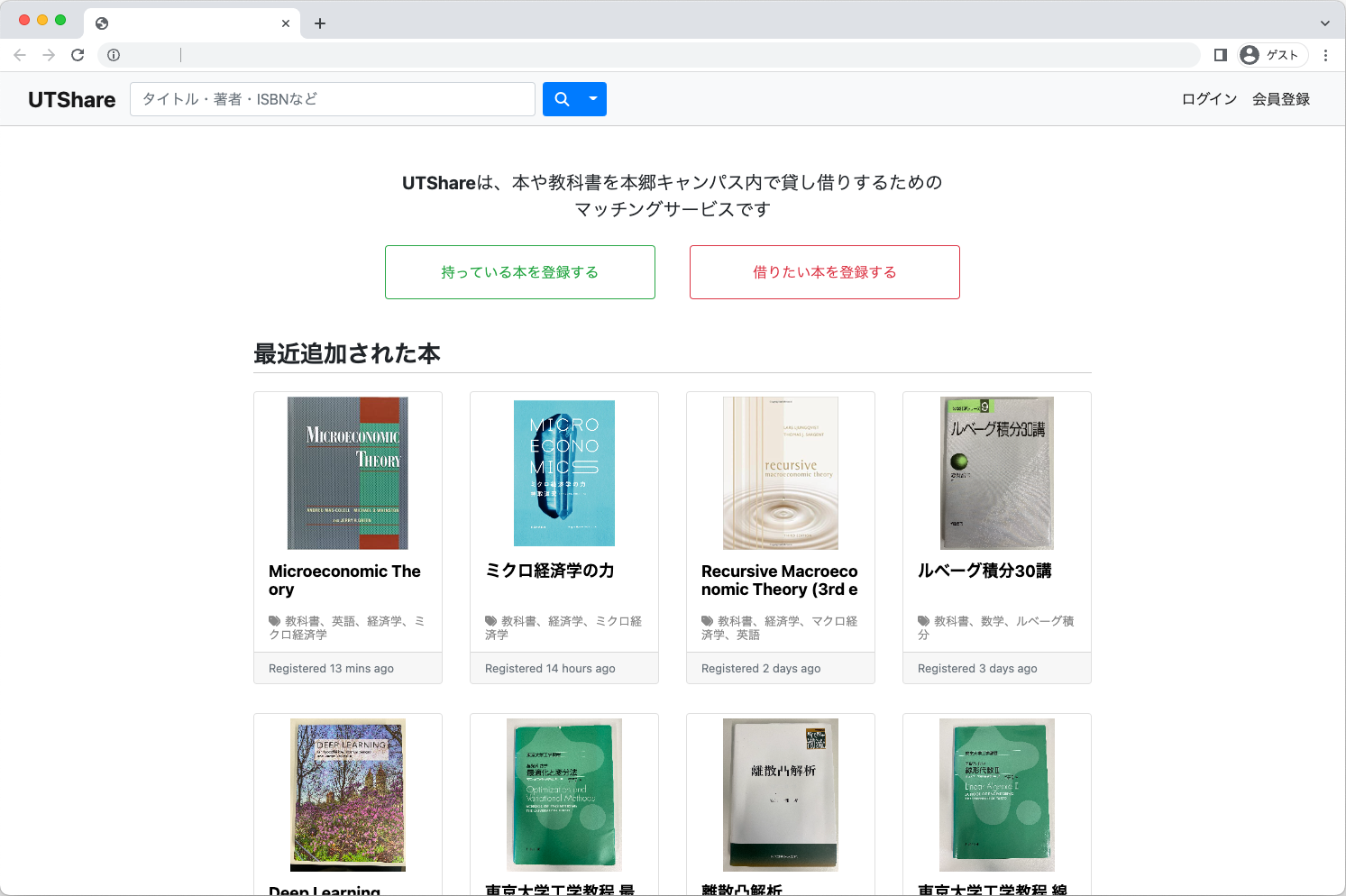 学内で教科書をはじめとした本の貸し借りを行うサービスです。登録時に付与されるトークンを使い、他のユーザーの本を短期間(1日〜1週間)借りることができます。使用したトークンは本の借り手から貸し手に移動し、貸し手はそのトークンを使ってまた本を借りることが可能です。登録されている本を借りるだけではなく、借りたい本のリクエストを出したり、読むべき本を詳しい人に相談することも可能です。
